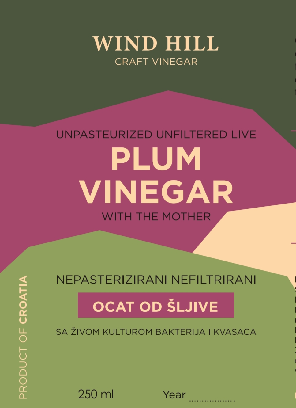 Ocat proizveden prirodnom polaganom fermentacijom i tradicionalnom metodom uz prisustvo prirodnih/divljih kvasaca i dobrih bakterija. Nepasterizirani, nefiltrirani s “Wild mother” probiotičkom kulturom. Snaga prirode sačuvana u octu!